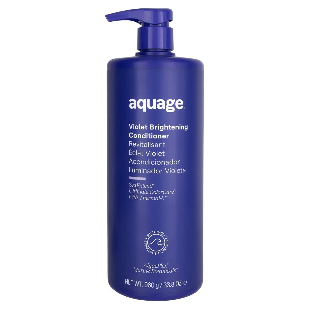 The ultimate in brilliantly bright blonde care comes Aquage Violet Brightening Conditioner. Blonde and grey hair looks yellow/orange after a few washes due to natural minerals found in water and occasionally from the residue left behind from hair products. Combat those brassy tones with the Aquage Violet Brightening Conditioner. This conditioner contains purple pigments that neutralize unwanted yellows in blonde, platinum, or grey hair. It also has Aquage's signature AlgaePlex. This restorative marine botanical helps strengthen, smooth, and protect hair. In addition, this conditioner is free of any sulfates, parabens, and sodium chloride making it safe for colored or chemically treated hair. Aquage bottles are also created from 100% recyclable ocean-bound plastics making them an excellent choice for those eco-conscious beauty lovers.