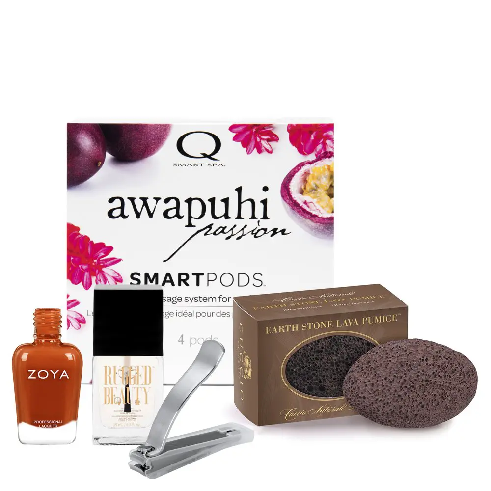 The BCC Exclusive Pedicure Essentials Set features the Qtica Smart Spa SmartPods set in the fragrance of Awapuhi Passion, The Cuccio Earth Stone Lava Pumice, Mehaz Professional Pro Curved Toenail Clipper, Rugged Beauty Avocado Cuticle Oil, and your choice between three stunning polish shades! These polishes are the Rugged Beauty Nail Polish - Brick & Mortar, Zoya Nail Polish - Cory, and the OPI Nail Lacquer - Don't Tell a Sol. With this collection, you can achieve the perfect pedicure time after time.