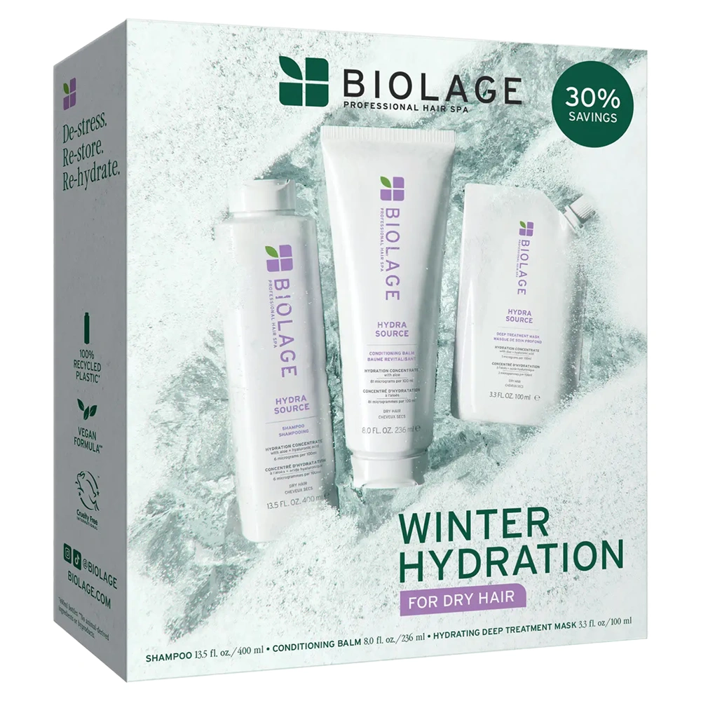 Revive dry and thirsty hair strands this holiday season with the Biolage Winter Hydration Hydra Source Holiday Kit.