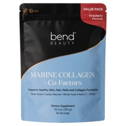 - The Bend Beauty Skincare Marine Collagen + Co-Factors Dietary Supplement Powder contains a complementary blend of collagen peptides, silicon, and whole-food vitamin C to promote healthy hair and nails and support collagen production in the body. These supplement powders come in a variety of different flavors, including Strawberry, Coconut, and Unflavored! Each of these powders helps with collagen formation, wound healing, and immune function, and is an excellent source of antioxidants that helps to protect skin against free radical damage while maintaining healthy skin, hair, and nails!