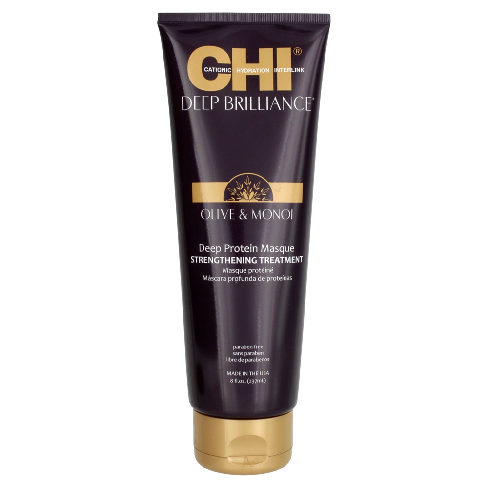 Restore overall hair health with Chi Deep Brilliance Deep Protein Masque. This Masque is made with a blend of natural Olive Oil Monoi Oil and other botanical herbs and vitamins to reconstruct dry, damaged hair using a blend of Olive Oil & Monoi Oil while a protein-rich complex of natural essential oils, botanicals, herbs, and vitamins leaves hair softer, stronger, and manageable.