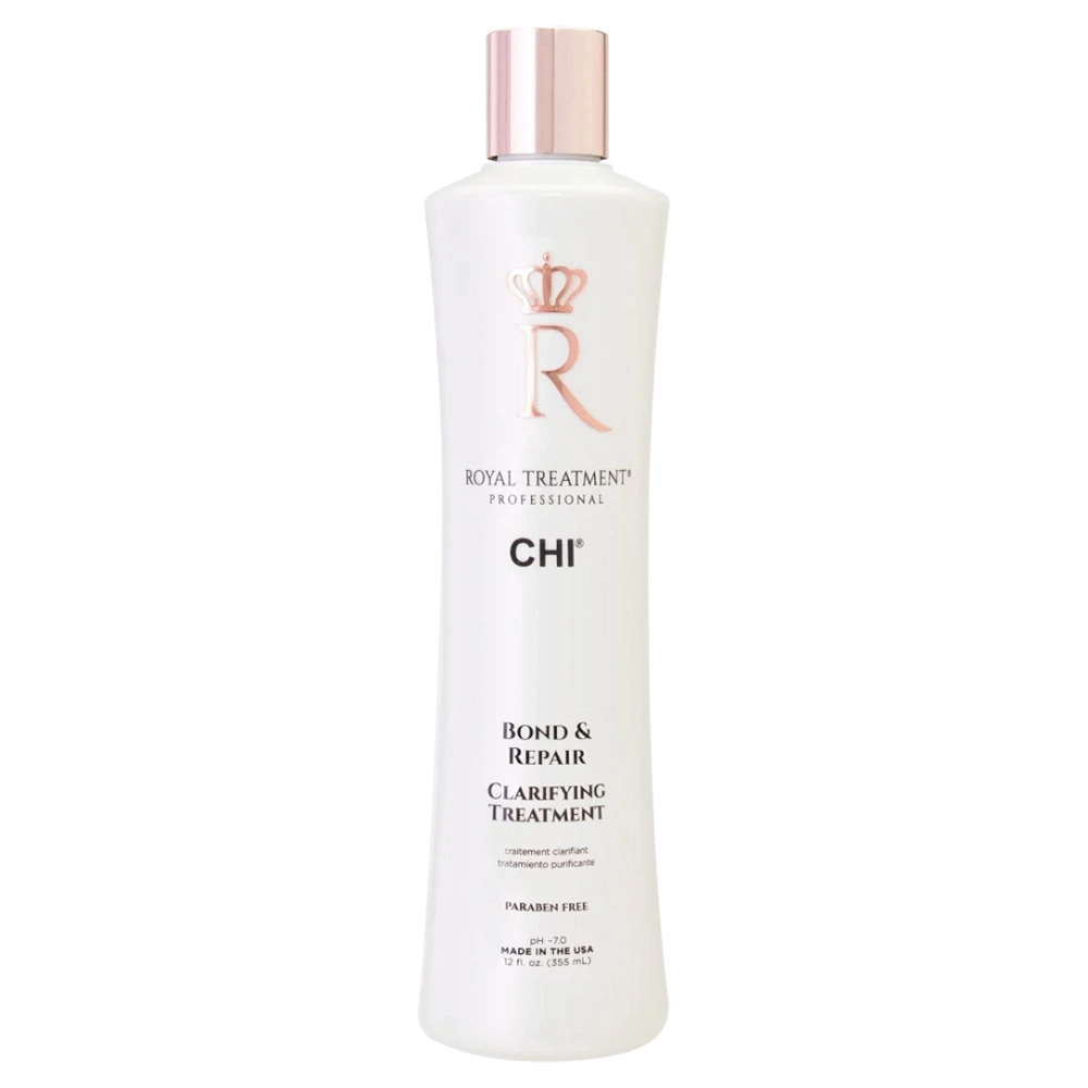 The CHI Royal Treatment Bond & Repair Clarifying Treatment is a demineralized and porosity equalizer that helps clarify and treat hair by removing mineral and metal deposits and buildup. This treatment is ideal to use before you receive a color service, as it helps to create an even canvas for the color application. In as little as 5-10 minutes, the CHI Royal Treatment Bond & Repair Clarifying Treatment removes hard water build-up in the hair, as well as product build-up, helping to even out the hair's porosity and balance the hair's pH to a 7. This treatment is free from parabens, gluten, and silicone and is infused with the same hair-healthy ingredients as the rest of the Royal Treatment Bond Repair Collection. These ingredients include White Truffle, Pearl, and Aloe Vera, which contain Vitamin B, amino acids, proteins, and moisturizers. With the CHI Royal Treatment Bond & Repair Clarifying Treatment, your hair will be left healthy and balanced.