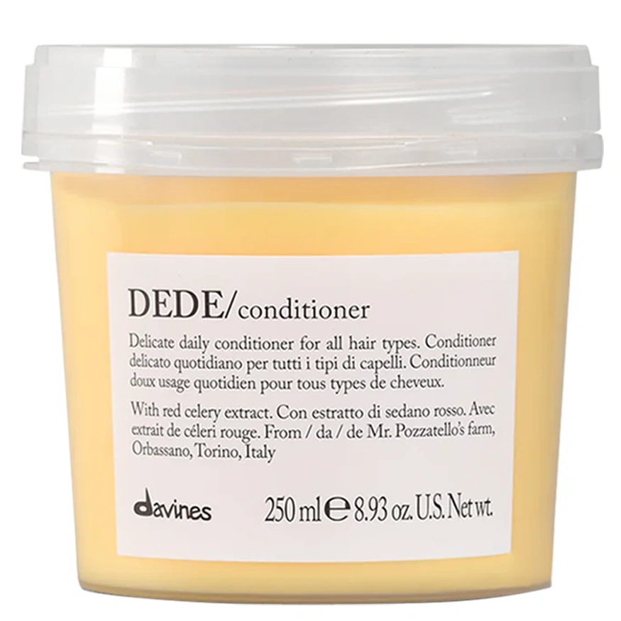 The Davines Dede/ Conditioner is a lightweight daily conditioner that is ideal for those with fine to medium hair textures. This conditioner's ultra-moisturizing formulation is designed to untangle hair, making it soft, without weighing it down! The Davines Dede/ Conditioner helps hair's combability and is infused with natural active ingredients. The active ingredient in this conditioner is red celery extract, which is full of mineral salts and is high in water content helping to deeply nourish hair strands. This extract is sourced from the farm of Mr. Doriano Pozzatello in Orbassano, Turin, Italy as a part of Slow Food Presidia. The Davines Dede/ Conditioner is the perfect daily conditioner to leave each and every hair strand well nourished, easier to comb through, and well protected.