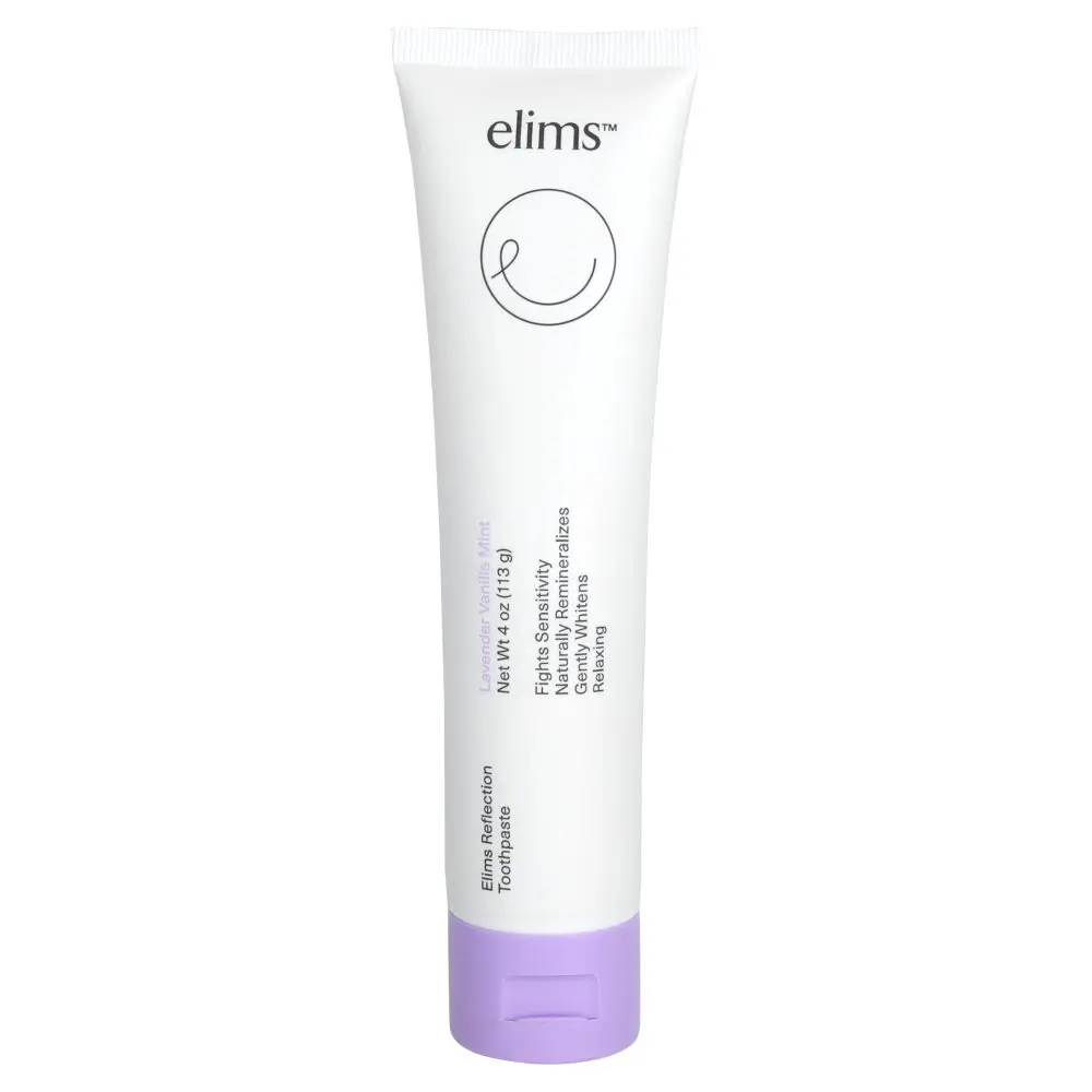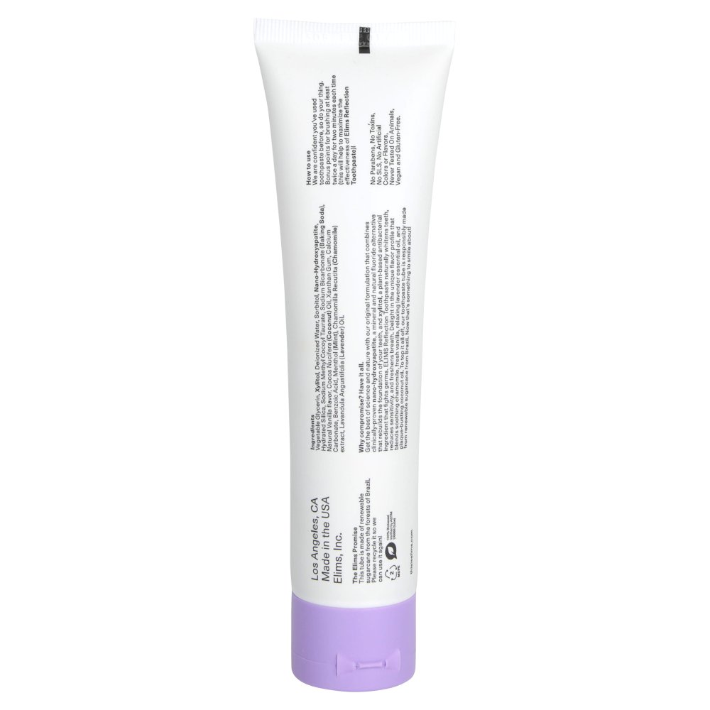 The Elims Reflection Toothpaste - Lavender Vanilla Mint is a naturally derived mineral toothpaste that was crafted by dentists to remineralize your enamel and fight against sensitivity. Harnessing the power of 10% nano-hydroxyapatite, which is a clinically-proven natural fluoride alternative used for over 40 years in Japan, and xylitol, a plant-based ingredient to deeply clean teeth and promote dental health. Xylitol has been shown to reduce tooth decay and the occurrence of gum disease. Then, baking soda and coconut oil gently whiten teeth. The Elims Reflection Toothpaste - Lavender Vanilla Mint features a unique flavor blend of soothing chamomile, creamy vanilla, and relaxing lavender essential oil, with a hint of mint!