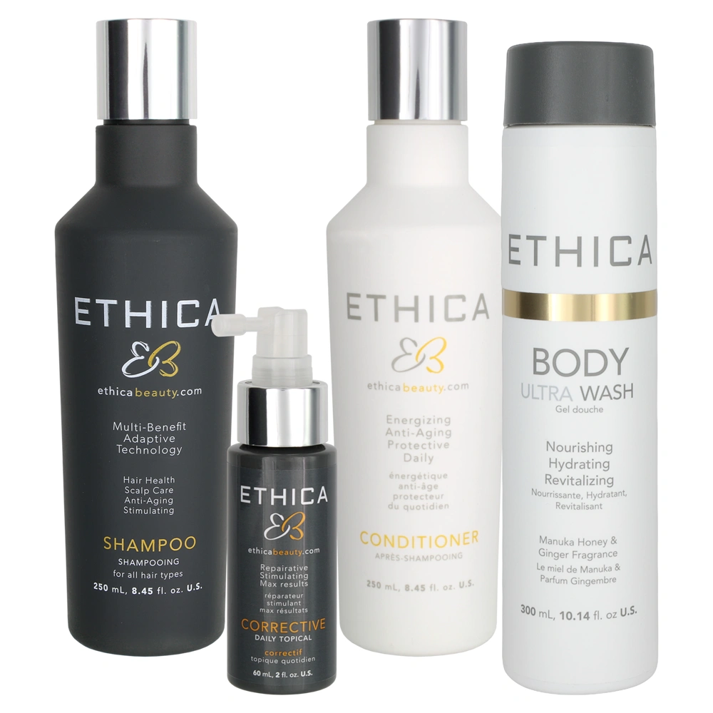 The Ethica Corrective Head to Toe Set features the Ethica Anti-Aging Daily Shampoo and Conditioner, the Body Ultra Wash, and the Corrective Daily Topical to provide you with a plant-based solution for hair, scalp, and skin care. This collection is ideal for those with moderate to advanced hair thinning, and leaves hair fuller and denser!