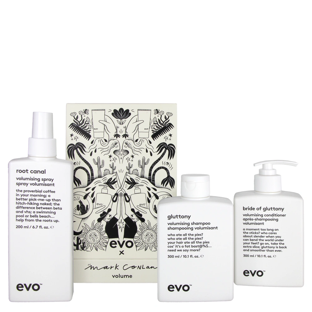 This volumizing set includes the Evo Gluttony Shampoo, Bride of Gluttony Conditioner, and Root Canal Volumising Spray, which will give your hair an overload of volume!