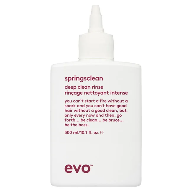 The Evo Springsclean Deep Clean Rinse is a deep cleaning rinse that removes product build-up, dirt, and excess oil from the hair without stripping color, natural oils, or hydration. It is formulated with hydrolyzed quinoa to add incredible strength to curls and protection to maintain color vibrancy. Jojoba seed oil moisturizes, softens, and reduces frizz, while antioxidant avocado oil protects hair and maintains its natural hydration levels. The Evo Springsclean Deep Clean Rinse is great to use when curls are dirty and oily and an ultra-deep clean is required.