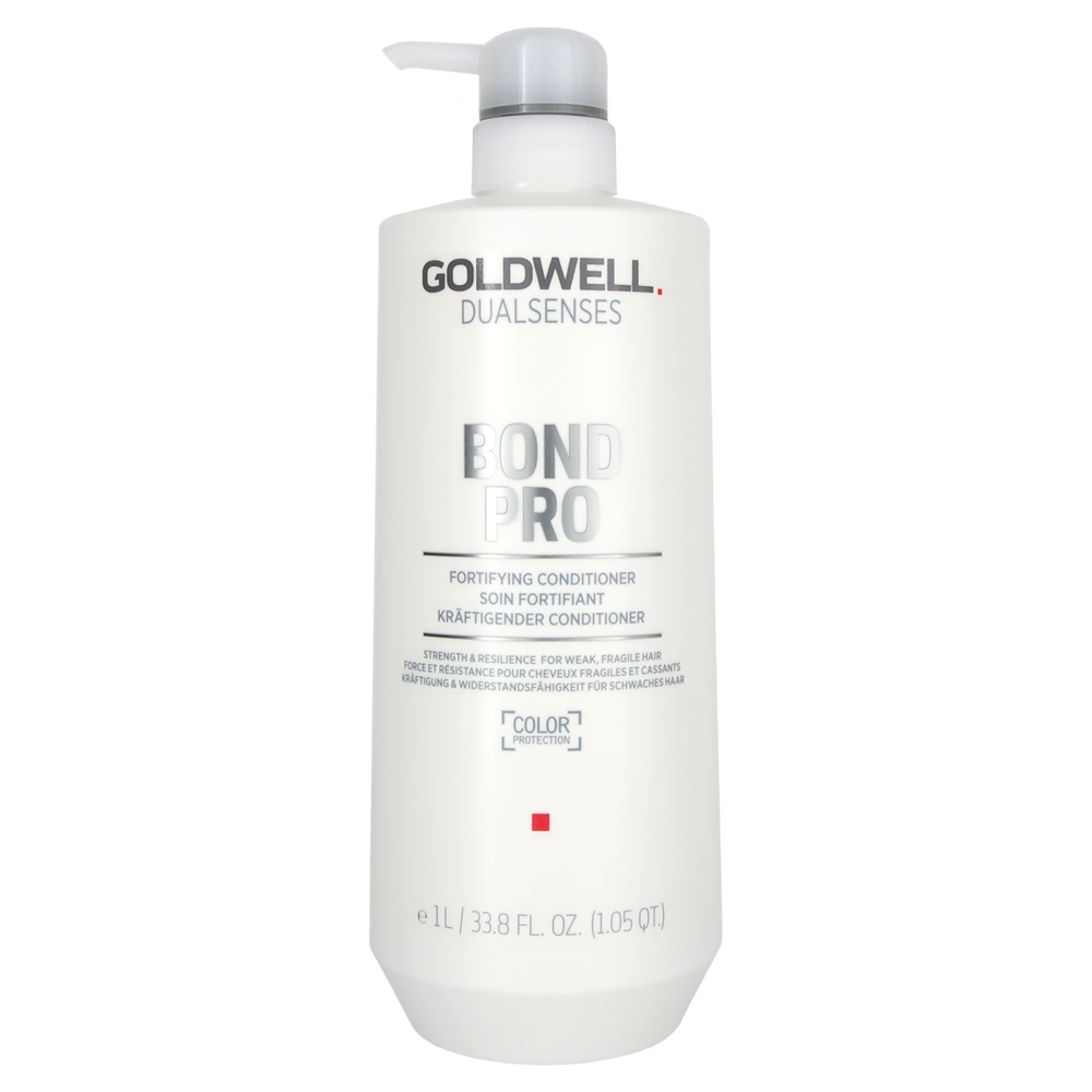 This conditioner for weak and fragile hair is formulated with Goldwell's microPROtec complex and Inter-Amino-Bond-Builder to provide strength to weak points in the hair shaft. The Goldwell Dualsenses Bond Pro Fortifying Conditioner is infused with soy protein to reinforce hair for instantly stronger hair with visibly less breakage. Peptides and amino acids penetrate the hair cortex, targeting the damaged areas, while compounds of red and brown algae extracts form ionic and hydrogen bonds with remaining hair proteins, embedding these peptides in the inner cortex. The Goldwell Dualsenses Bond Pro Fortifying Conditioner features a scent of delicate and fresh tea, wrapped by subtle orris and musks with a touch of velvet peach skin and precious cedar wood.