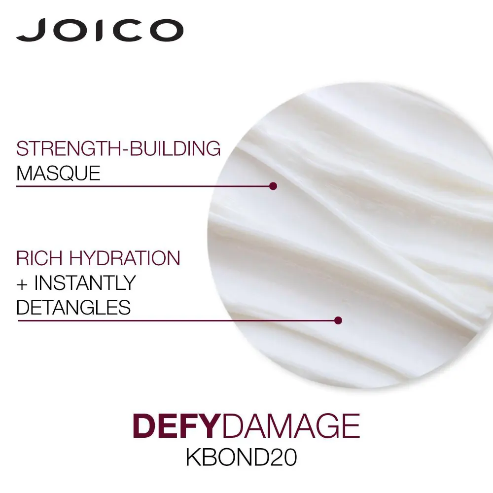 The Joico Defy Damage KBond20 Power Masque is a super-charged hair repair mask that rebuilds broken bonds within the hair and delivers 5 times stronger hair strands. It is formulated with Joico's K-Pak Keratin technology to rebuild hair strength and resilience. This masque harnesses the power of 18 essential amino acids, including Arginine, naturally found in healthy hair strands. The Joico Defy Damage KBond20 Power Masque also uses a protective lipid that acts as a first defense against hair pollution and provides hair with rich hydration. This masque is also formulated with Moringa Seed oil, which is rich in antioxidants vitamins A, E, and silica that help revive dry and tired hair strands while adding instant detangling. The Joico Defy Damage KBond20 Power Masque protects hair strands from mechanical, thermal, and environmental damage, is color-safe, and helps to normalize hair's pH. It is free from parabens and has never been tested on animals. With this hair masque, you can experience healthier and stronger hair strands with each use.