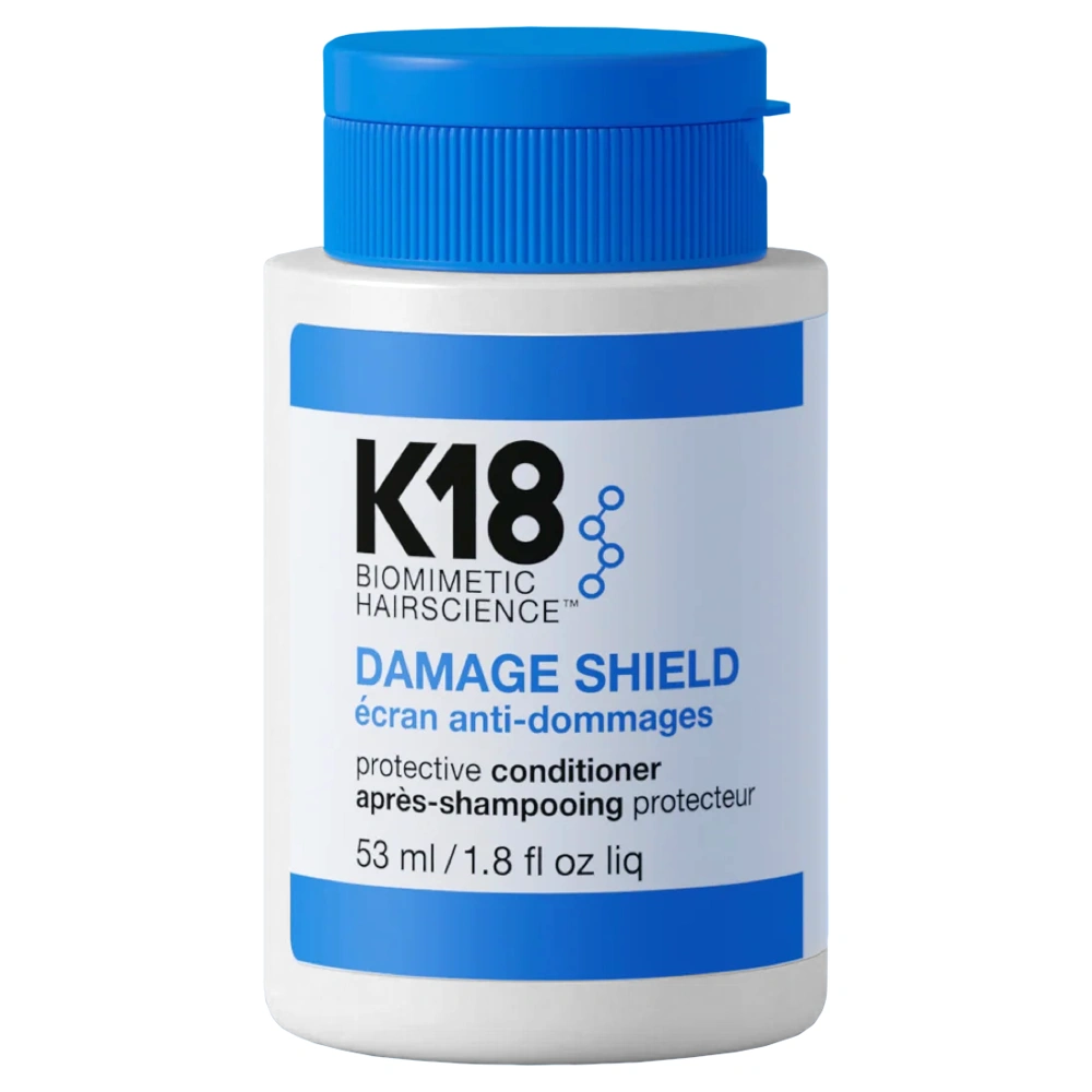 The K18 Biomimetic Hairscience Damage Shield Protective Conditioner helps to shield and protect hair from daily damage. This damage includes protection from harmful UV rays, environmental aggressors, and mechanical styling. This reparative conditioner helps to maintain hair health while improving smoothness and shine. This conditioner was expertly engineered to weightlessly soften and detangle hair strands, while the K18Peptide helps to replenish hair while you wash. This powerful peptide helps to fortify the hair's exterior lipid barriers to make hair more resilient and resistant to damage. Its pH-optimized formula aids in minimizing excess cuticle swelling while you washing, helping to keep hair strands smooth and increase hair shine. The K18 Biomimetic Hairscience Damage Shield Protective Conditioner is formulated without heavy silicones and waxes that can build up on the hair over time, resulting in hair strands that are well-hydrated, protected, and ultra-lightweight.