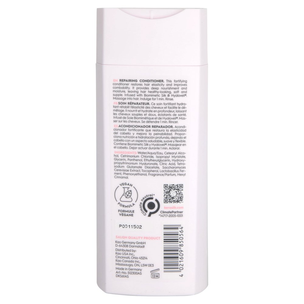 The Kerasilk Repairing Conditioner is formulated without dyes, silicones, sulfates, mineral oil, or microplastics, and has a vegan formula. Ideal for dry, thirsty, stressed, and damaged hair, bleached or chemically-treated hair.