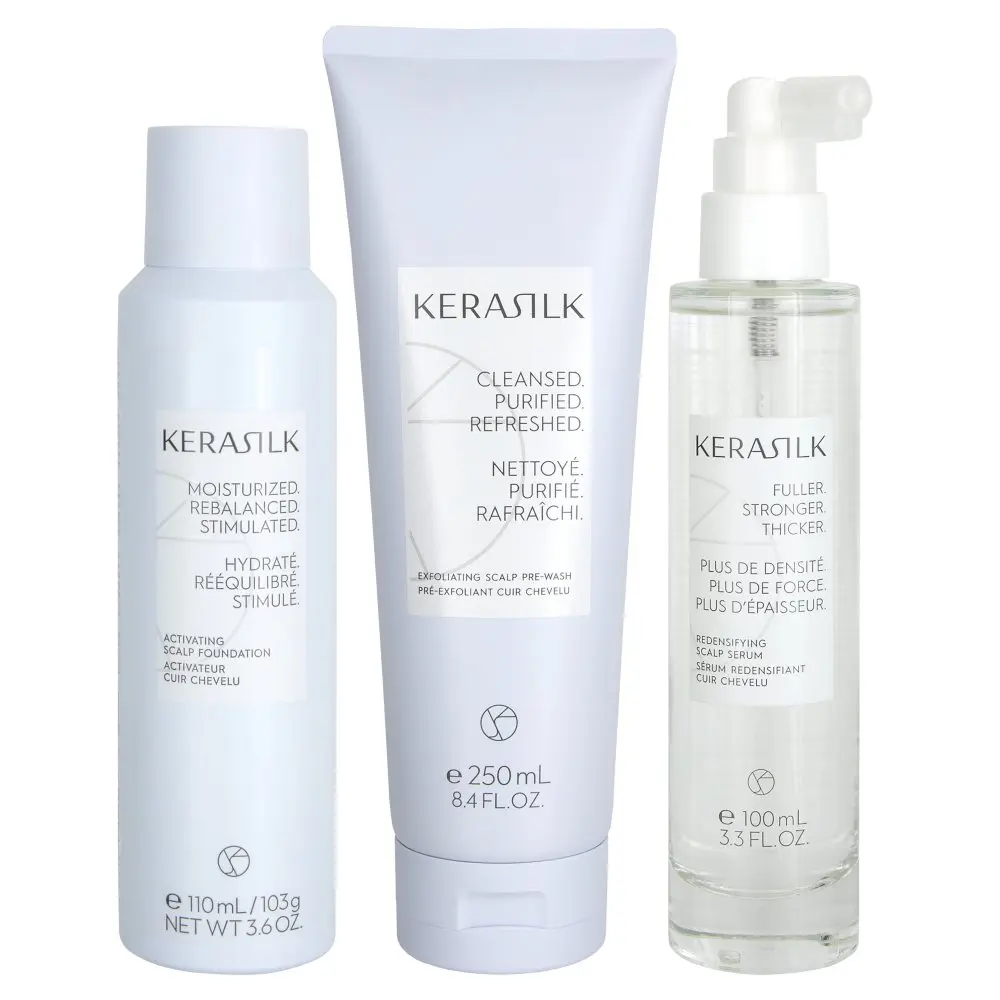 The Kerasilk Scalp Care Trio is formulated without dyes, silicones, sulfates, mineral oil, or microplastics and has a vegan formula.