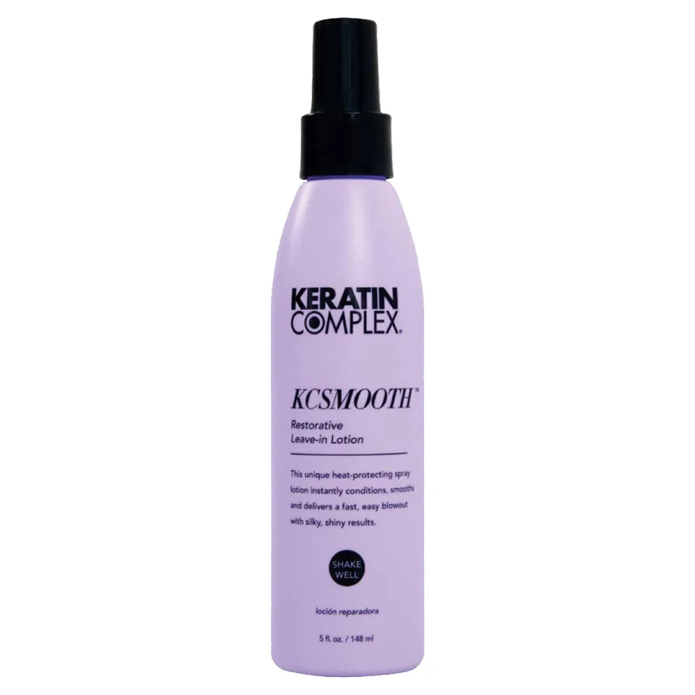 Take care of your keratin-treated hair with this leave-in lotion. Step 2 of the KCSMOOTH Heat Activated Smoothing System, which is essential to client aftercare for the service. The Keratin Complex KCSMOOTH Restorative Leave-In Lotion instantly conditions, smooths, and delivers a fast, easy blowout with silky, shiny results. This spray's super hydrating formula doesn't weigh the hair down, provides strands with heat and UV protection, detangles, decreases drying time, and delivers incredible shine with a super-soft and silky feeling. The Keratin Complex KCSMOOTH Restorative Leave-In Lotion is infused with Keratin to prevent damage and increase strength for smoother, healthier hair.