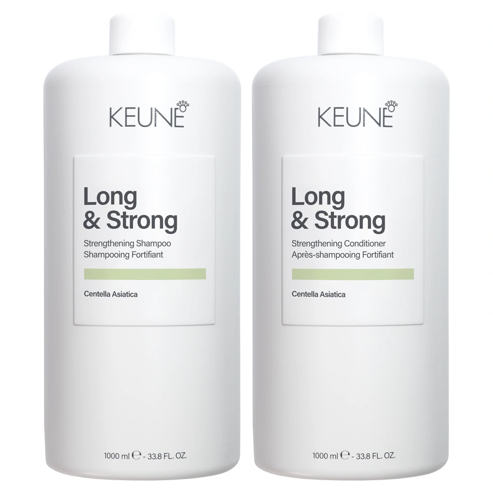 The Keune Long & Strong Strengthening Shampoo & Conditioner Set is an incredible shampoo and conditioner duo that improves hair's resilience and leaves each and every hair strand feeling healthier, shinier, and more resilient with each use. This duo is ideal for seasonal hair shedding, postpartum hair loss, or weak regrowth. The Keune Long & Strong Strengthening Shampoo is a gentle cleansing shampoo that delivers strengthening actives while you cleanse. This shampoo features a sulfate-free formula that gently clarifies the scalp to remove build-up and pollution, improving overall scalp health. This shampoo is paired with the Keune Long & Strong Strengthening Conditioner, an incredibly fortifying conditioner that is designed to repair damaged hair and boost softness. This conditioner features a lightweight formula that provides nourishment from within, leaving hair strands stronger, smoother, and more resilient to daily stress. This duo provides hair with antioxidant protection and is infused with Centella Asiatica, Biomimetic Peptides, and Marine Density Infusion. Centella Asiatica is known for its soothing and regenerative properties. This helps to stimulate circulation and delivers essential nutrients directly to the scalp. Centella Asiatica strengthens the hair fiber from root to tip, promoting resilience and restoring vitality for thicker and healthier-looking hair. Biomimetic Peptides work to reinforce hair at the cellular level and mimic the natural proteins found in the hair. This helps to strengthen strands and extend hair's growth cycle and boost overall density. The Marine Density Infusion is formulated to boost hair density and strengthen strands. This technology works to fortify each and every hair strand to increase the thickness and hair's resilience to damage. The Marine Density Infusion additionally helps to extend hair's longevity while improving density, fullness, and overall hair health. The Keune Long & Strong Strengthening Shampoo & Conditioner Set provides hair with a light touch and a fragrance of Soleil with a warm, floriental blend of mandarin, jasmine, praline, and soft vanilla.