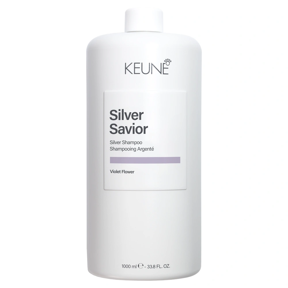 The Keune Silver Savior Silver Shampoo is a violet-based neutralizing shampoo that is expertly formulated to cleanse hair, while correcting yellow and warm undertones. This toning shampoo is ideal for those with cool blonde, silver, or platinum hair and harnesses the power of violet pigments and nourishing ingredients. The Keune Silver Savior Silver Shampoo is infused with Bond Fuser Technology and Violet Flower. Violet Flower is naturally rich in color-protecting pigments and helps to counteract yellow and brassy tones. This helps to leave hair bright, cool, and true to tone. This flower additionally provides hair with lightweight hydration to keep strands soft and manageable. Keune's Bond Fuser Technology works at the molecular level to reinforce the hair's internal structure, repair damage, restore strength, and leave hair strong and incredibly resilient. The Keune Silver Savior Silver Shampoo leaves hair clean, cool-toned, and luminous, without drying or dulling the hair. This shampoo features an azure sky fragrance of clean and uplifting cucumber, apple, grapefruit, soft floral notes, as well as sandalwood and amber.