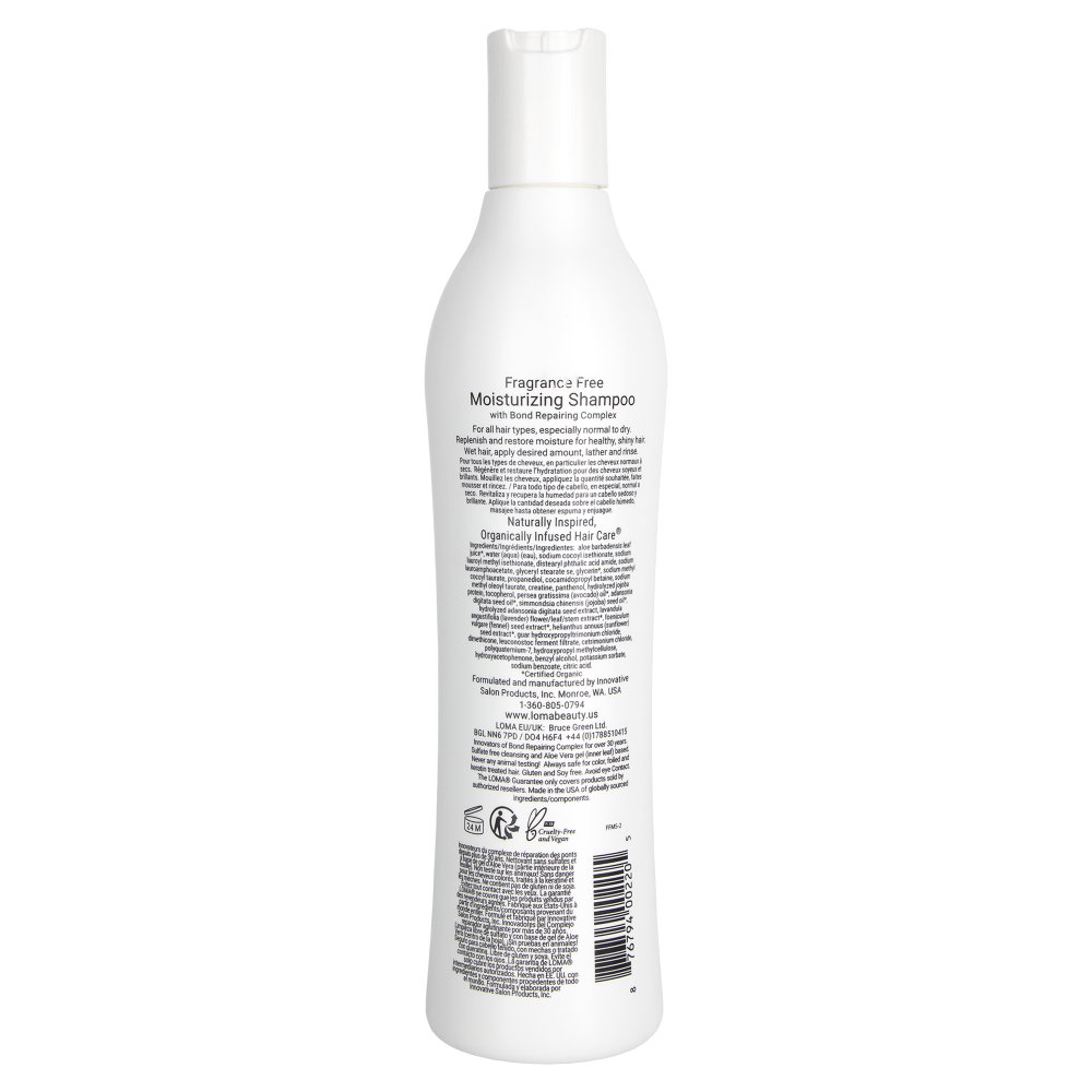 Deeply moisturize your hair with the Loma Fragrance-Free Moisturizing Shampoo with the same formula as the Loma Moisturizing Shampoo without any fragrance. Ideal for those with extreme sensitivities, this shampoo is certified organic and has ingredients specifically selected to enhance, protect, restore, and repair the hair's natural moisture balance while providing vibrant shine. This thirst-quenching shampoo is designed for all hair types and textures and leaves hair with restored moisture and replenished softness. The Loma Fragrance-Free Moisturizing Shampoo is also color-safe and helps to add manageability to hair. In addition to its moisturizing benefits, the Loma Fragrance-Free Moisturizing Shampoo is also free from sulfates, parabens, and sodium chloride. These harmful chemicals can strip the hair of natural oils and cause dryness and damage. The absence of fragrance in this shampoo makes it suitable for those with allergies or sensitivities to scents.