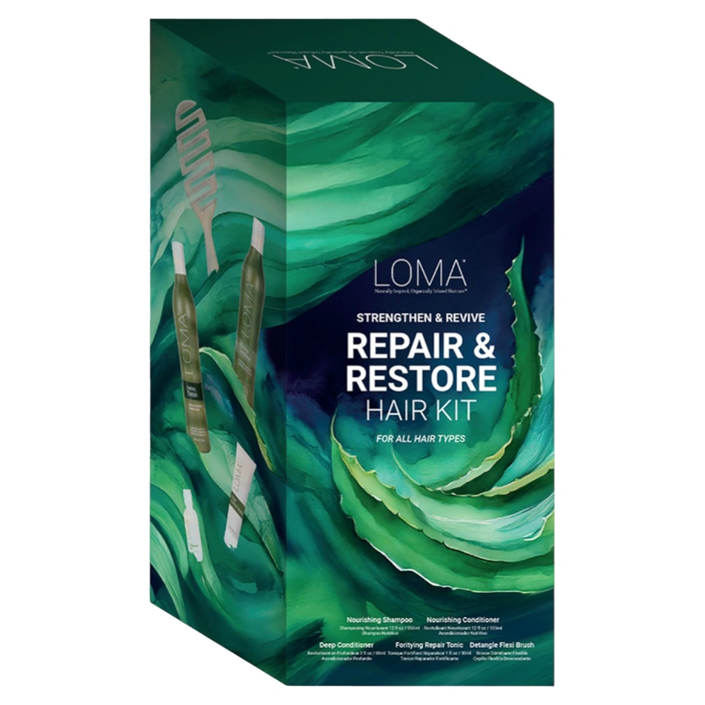 This holiday hair gift box features the Loma Nourishing Shampoo, Conditioner, Deep Conditioner, Fortifying Repairative Tonic, and the Detangle Flexi Brush. This holiday hair kit helps to transform hair strands to create stunning and healthy styles this holiday season.