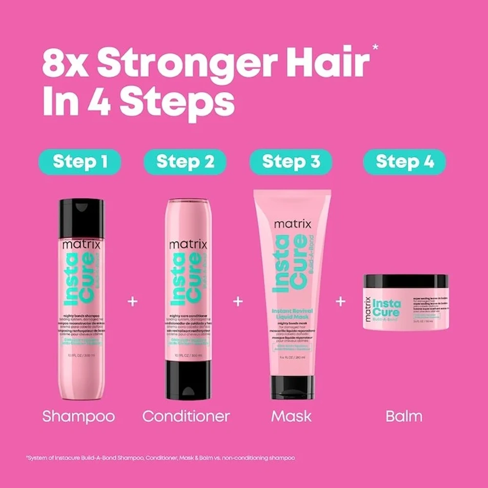 The Matrix Insta Cure Build-A-Bond Collection features the Matrix Insta Cure Build-A-Bond Mighty Bonds Shampoo, Mighty Care Conditioner, Instant Revival Liquid Mask, and the Super Sealing Leave-In Balm to leave hair strands stronger deep down to the fiber!
