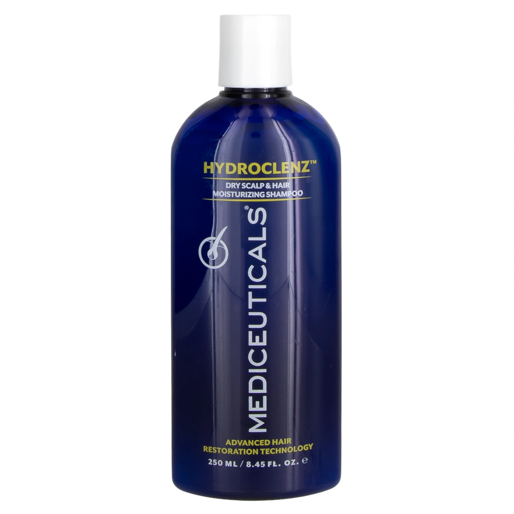 The MEDIceuticals HydroClenz Dry Scalp & Hair Moisturizing Shampoo is an ultra-hydrating shampoo for those with dry, coarse hair and a dry scalp. This hydrating shampoo was developed to reduce excessive hair loss, thinning hair, and stimulate the production of new hair growth. The MEDIceuticals HydroClenz Dry Scalp & Hair Moisturizing Shampoo gently cleanses the scalp and penetrates into the hair follicles, helping to reduce excessive hair loss and thinning hair. This shampoo is sulfate-free, so it's gentle on color-treated hair and helps to stimulate blood circulation in the scalp. This helps the shampoo to absorb deeply into the scalp so that the follicles get all the nutrients they need. Additionally, the MEDIceuticals HydroClenz Dry Scalp & Hair Moisturizing Shampoo is infused with complexes like the Triaminocoptinol Complex, Estrolin Complex, Nutracell Complex, and the Colour Retention Complex. The Triaminocoptinol Complex helps with the reduction of excessive hair loss and stimulates new hair growth, while the Estrolin Complex uses various anti-androgens, vitamins, and minerals that inhibit the formation of DHT in the hair follicle. The Nutracell Complex helps to increase the microcirculation of the scalp to stimulate blood flow to the hair follicles, allowing hair follicles to better absorb oxygen and nutrients needed for the development of healthy hair follicles and hair growth. Lastly, the MEDIceuticals HydroClenz Dry Scalp & Hair Moisturizing Shampoo uses the Colour Retention Complex to protect hair strands from UV rays that can cause color to fade out.