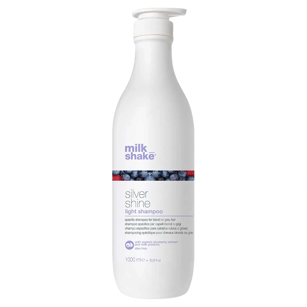 Keep your blonde hair strands bright and free from brass with the Milk_Shake Silver Shine Light Shampoo. This shampoo features 50% less violet pigment than the Milk_Shake Silver Shine Shampoo, allowing for gentle toning as you cleanse. This shampoo for grey hair, white hair, and blonde hair is best-suited for moderate toning maintenance. The Milk_Shake Silver Shine Light Shampoo is infused with Milk proteins, violet pigments, organic fruit extracts, and Milk_Shake's Integrity 41 Complex. Milk proteins have a conditioning and nourishing effect on the hair, giving strands strength and softness, while violet pigments help to neutralize unwanted yellow or warm tones. The organic fruit extracts in this shampoo provide hair with a protective, toning, emollient, and conditioning action for the scalp. This shampoo uses the Integrity 41 Complex, which features antioxidants that help to protect against stress factors that can threaten hair's integrity, color intensity, and shine. The Milk_Shake Silver Shine Light Shampoo leaves your hair free from unwanted brass and warmth, while leaving strands with a berry-fresh scent.