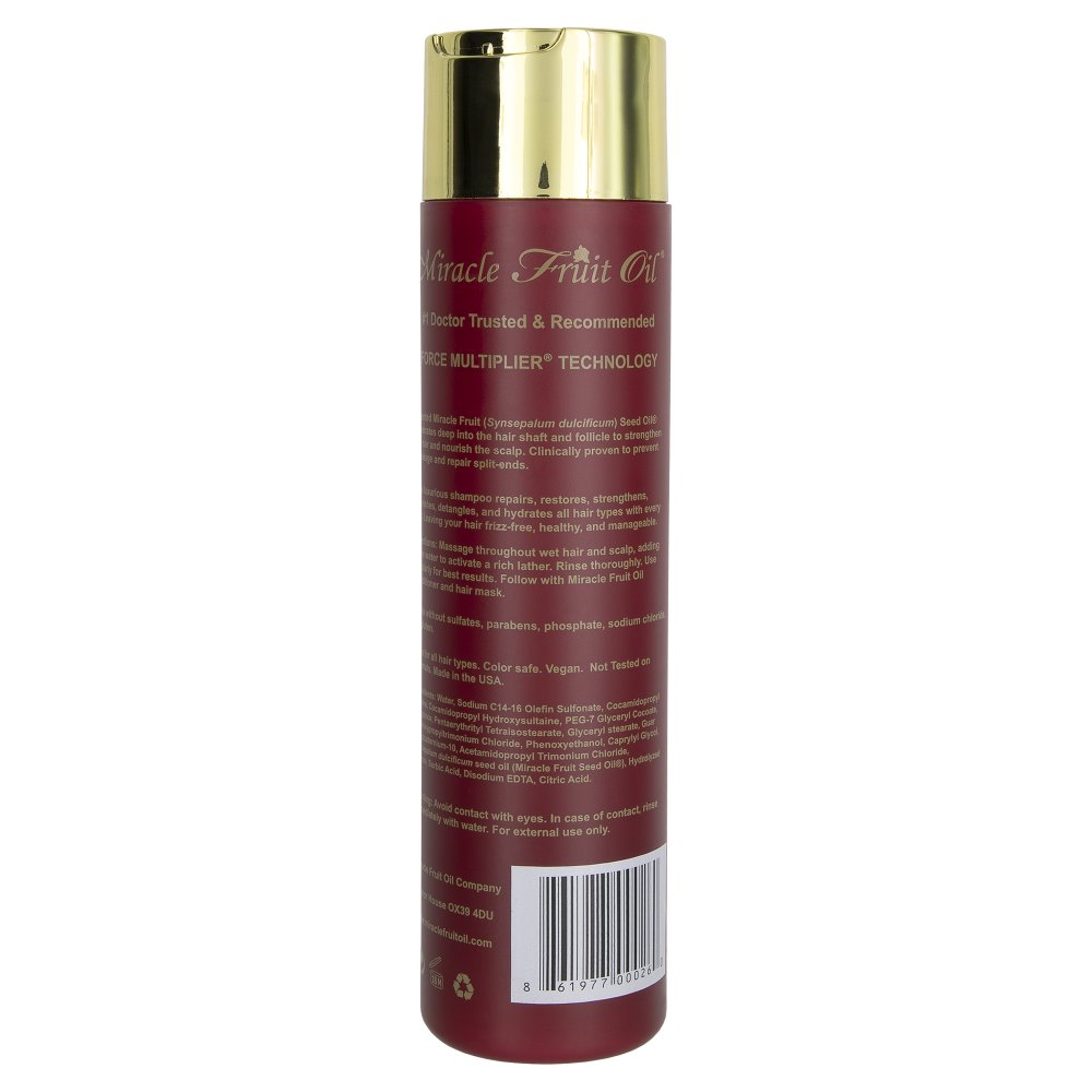 Massage throughout wet hair and scalp, adding more water to activate a rich lather. Rinse thoroughly. Use regularly for best results. Follow with Miracle Fruit Oil conditioner and hair mask.