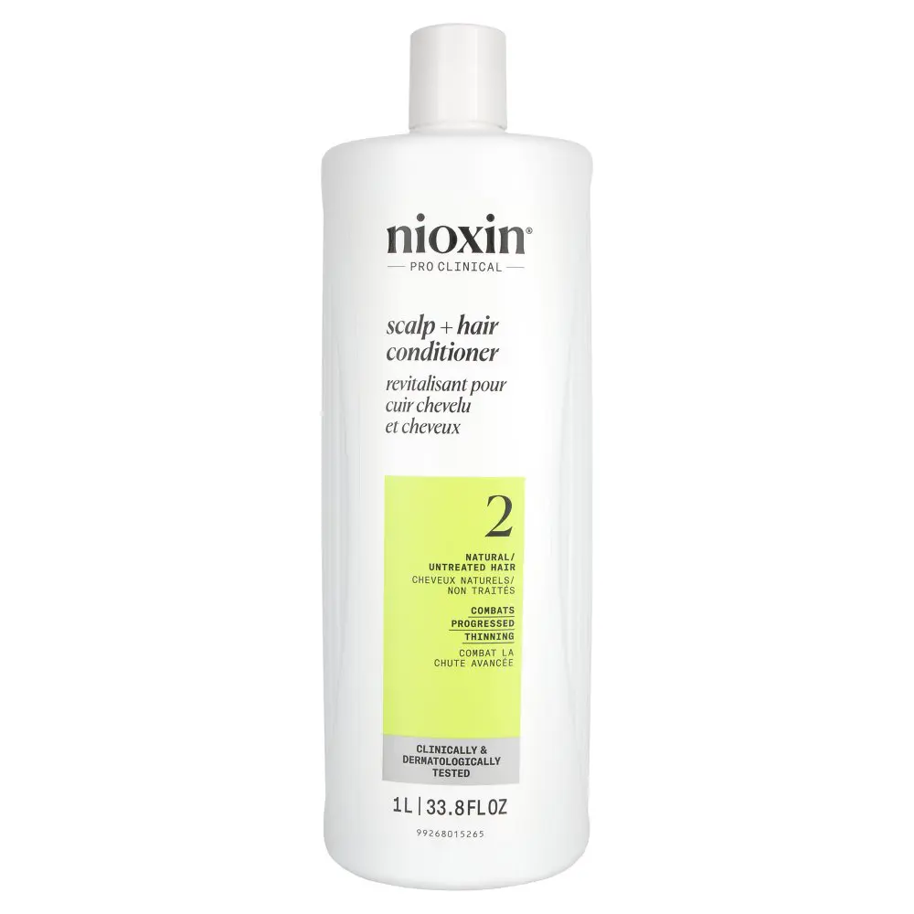 The NIOXIN System 2Scalp + Hair Conditioner for Natural/Untreated Hair is specially designed for noticeably thinning, fine, natural hair. It delivers denser-looking hair and a healthy shine while protecting the scalp. This density-protecting conditioner helps to retain moisture balance, providing hair resilience thanks to its BioAmp technology. This lightweight Nioxin conditioner is specially designed for hair with progressed thinning and leaves it fuller looking. The NIOXIN System 2 Scalp + Hair Conditioner for Natural/Untreated Hair reduces hair loss due to breakage and strengthens the hair. Amplifies hair protection and texture against breakage and increases the fullness of each hair strand. The NIOXIN System 2 Conditioner works best when used with the Nioxin System 2 Cleanser plus Scalp and Hair Treatment system.