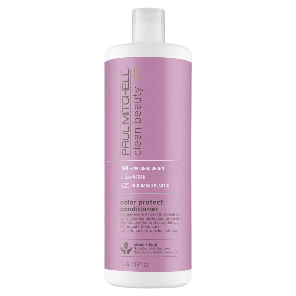 The Paul Mitchell Clean Beauty Color Protect Conditioner is designed for those with color-treated hair and is infused with antioxidant-rich pomegranate and Borage Oil to help you maintain healthy hair and vibrant color. The pomegranate extract provides hair with color protection and protection from environmental exposure and free radical damage. Additionally, pomegranate helps to strengthen the hair strand leaving it more resilient than ever. The Borage Oil in the Paul Mitchell Clean Beauty Color Protect Conditioner adds incredible softness, manageability, and shine to the hair with each and every use. This rich conditioner is crafted with 94% natural origin ingredients and is formulated without harsh chemicals like sulfates, parabens, formaldehyde, formaldehyde-releasing agents, mineral oil, coal tar, hydroquinone, and triclocarban.