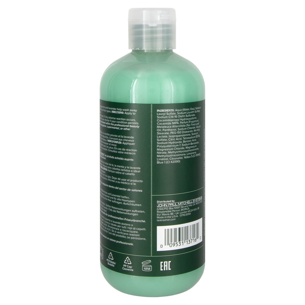 Sodium Lauryl Sulfate, Sodium Laureth Sulfate, Oleamidopropyl Betaine, Cocamidopropyl Betaine: A balanced blend of surfactants provides a rich lather and thorough cleansing. Melaleuca Alternifolia (Tea Tree) Oil:A completely natural, non-toxic disinfectant and germicide known for its healing properties; distilled from the leaves of the tea tree. Lavandula Angustifolia (Lavender) Oil: Essential oil distilled from the silvery lilac spikes of Lavandula Angustifolia, the well-known shrub which emits a cool, elegant, floral aroma with woody undertones. Mentha Piperita (Peppermint) Oil: Peppermint oil has a long tradition of medicinal use; the strong, penetrating aroma has a sweet undertone; the oil is extracted from the fresh flowering tops of the plants; soothing and energizing. Triticum Vulgare (Wheat) Germ Oil: Made from wheat kernel, this oil is rich in vitamin E and used as a natural antioxidant and emollient; rich in vitamin A, C and F and lecithin. Panthenol: Provides long-lasting moisture, reduces the formation of split ends, thickens hair, provides shine and helps repair surface damage.