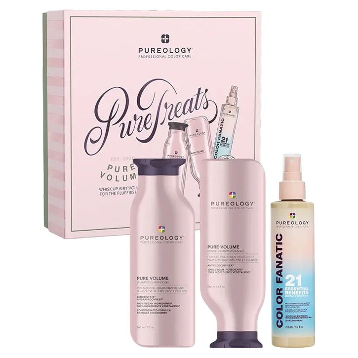 The Pureology Pure Treats Pure Volume Holiday Kit is the perfect gift for anyone looking to amplify their volume and sustain their rich hair color's vibrancy this holiday season.