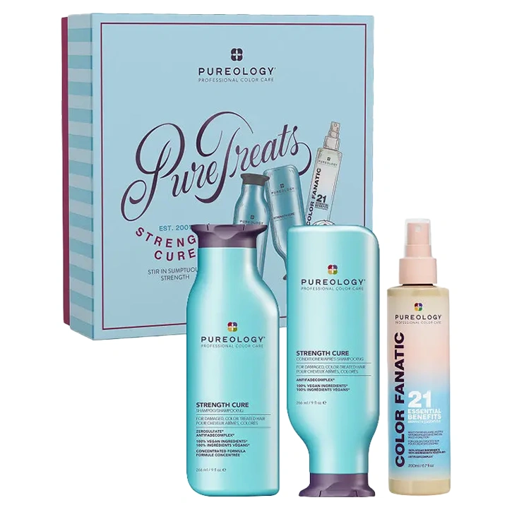 The Pureology Pure Treats Strength Cure Holiday Kit features the Pureology Strength Cure Shampoo and Conditioner, paired with the Pureology Color Fanatic 21 Multi-Tasking Leave-In Spray, to transform weak and brittle hair strands instantly. This incredible holiday trio will leave each and every hair strand strengthened, revived, protected, and restored during these harsh winter months.
