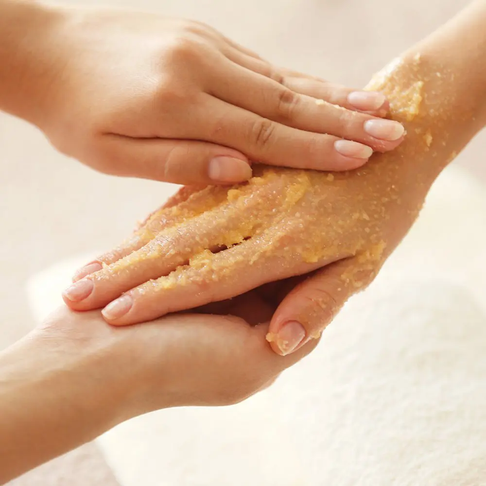 Exfoliate hands and feet with Sugar Scrub by Massage into the skin, concentrating on rough areas. Rinse with warm water and towel dry.