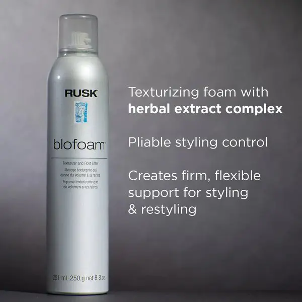The Rusk BloFoam Texturizer and Root Lifter creates maximum volume, extreme texture, and root lift. Perfect for unmanageable flat hair that needs root lift and a boost of volume. This unique texturizing foam not only boosts the body of your hair but it also leaves hair with a soft and shiny finish. Rusk BloFoam Texturizer and Root Lifter uses microspheres of foam to surround and bodify each individual strand, creating invisible firm, flexible support for styling and restyling perfection.