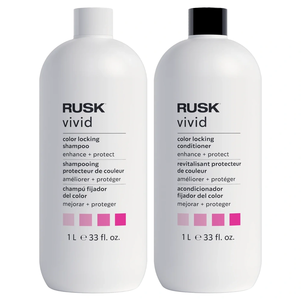 • Vivid Color Locking Shampoo: Apply to wet hair and lather. Rinse thoroughly. Follow with Rusk Vivid Color Locking Conditioner.